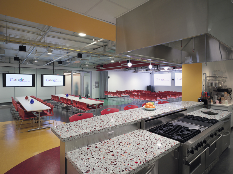 While working with Google in 2007 on their DC Policy office, the goal was to provide an environmentally conscious, fun, modern office environment. Google, who has well established Corporate Design Standards that reflect the Google culture, believes that all square footage is to be used at all times, so almost all spaces are multi-functional. Collaborative spaces such as Huddle Rooms easily become 2-3 person offices. Phone Booths can be used for interviews, and the “Tech Cafà ©” can be used for “Tech Talks”. The Main Conference Room is separated from the Secured Reception by roll-up garage doors that open to create one large area for conferencing, training or entertaining. The Google standards right sized each space type to allow the optimal multi-functional use to occur.