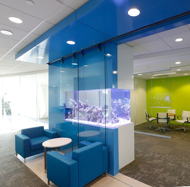 On Friday nights, people hang-out on the barstools for happy hour. The NeoSystems logo mark is etched into glass panels along the feature wall, anchored by the company’s signature 322-gallon fish tank.