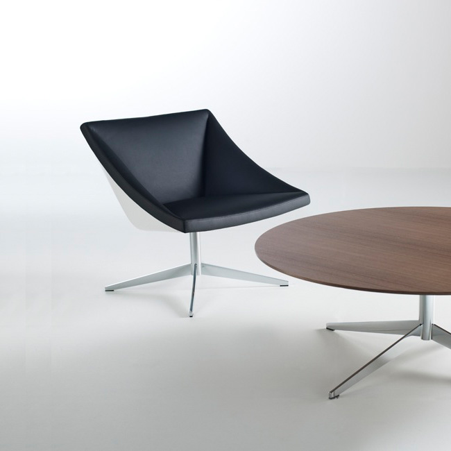 Known for his minimalist approach, Wolfgang C.R. Mezger’s latest creation does not disappoint. With its clean aesthetic, C.R. Lounge boasts an unexpected mixture of very hard, abrupt lines and very soft, comfortable seating. The chair is available fully upholstered in fabric or leather or in contrasting front and back fabrics. For even more visual drama, users have the option of marrying an upholstered front with a white or black glossy plastic shell. Though it is certainly striking enough to stand alone, C.R. Lounge also works well when grouped around one its coordinating coffee tables.