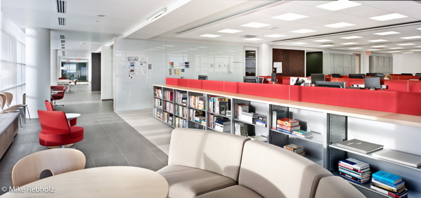 The cafe is also used for brainstorming sessions. With no closed-in conference room, employees feel less constricted by the pressure to only bring up “good ideas” sometimes associated with a traditional office. Because the space is open, inviting, and neutral, employees enjoy meeting with one another.
