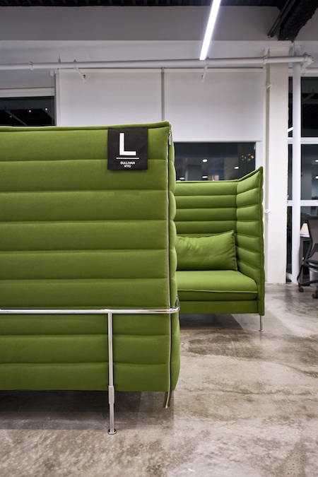 Admittedly, good work sometimes requires solitude and focus in a single location. To give our employees places of retreat and concentration, we installed Vitra pods, of which the high, upholstered sides block out most of the din from the open floor.