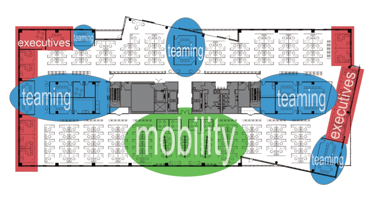 In the end, IBM managed to reduce their regional real estate footprint by 60%, from 300,000 SF to 125,000 SF, saving approximately $5 million annually. In addition, IBM’s workplace efficiency was increased by 62%, reducing the SF/per person ratio to 183 SF/person, and 70 SF/person with hoteling.