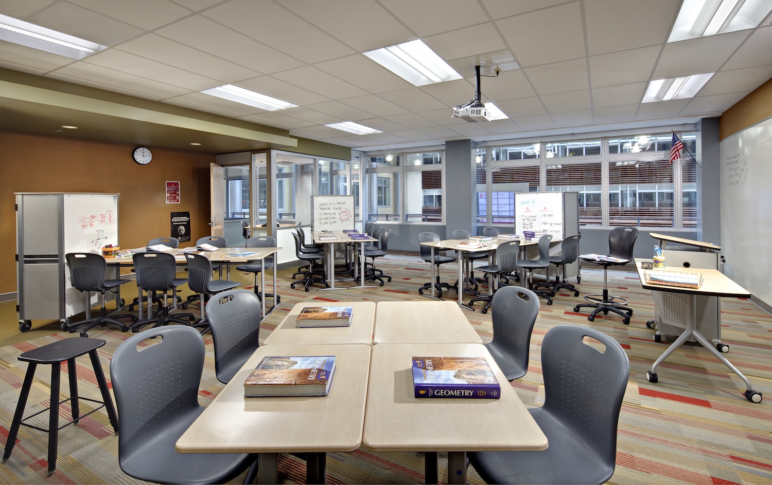 For Naperville Central High School in Illinois, we provided three mock-up classrooms dedicated to full-time teachers and a fourth was available to any teacher to use for a week or two. The mock-ups used mobile furniture and gave students and teachers a flexible classroom that could be rearranged within minutes without the need to call in maintenance staff. A teacher might be using a lecture format and then direct students to work in small groups — either by turning their swivel chairs to face a table behind them or by moving their mobile tables into small groups and using a mobile whiteboard.