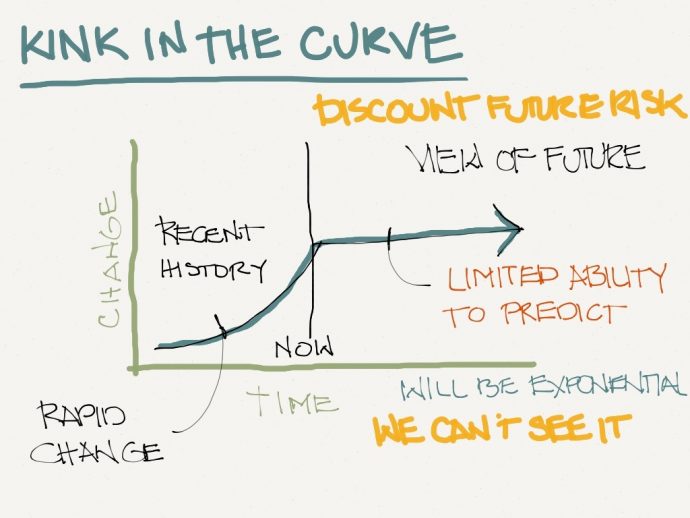 The “kink in the curve” is the present day, where everything seems calm after disruptive unexpected change, and everything in the future seems like it’ll be smoother. Its our way of coping, or we experience what Alvin Toffler termed “Future Shock.”