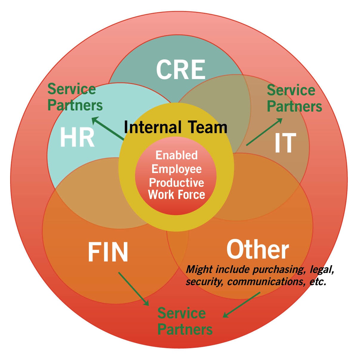 Consider CRE as a perfect example. The organization needs CRE to understand mission and strategy, plus coordinate internal goals and operations with HR, IT, and FIN. That CRE then also needs to represent those needs to outsourced real-estate experts who have in-depth, highly detailed, market-specific knowledge and expertise. The CRE can focus on the corporate need and let other experts more efficiently provide knowledge about real estate markets, types of spaces and systems, and new ways of working.