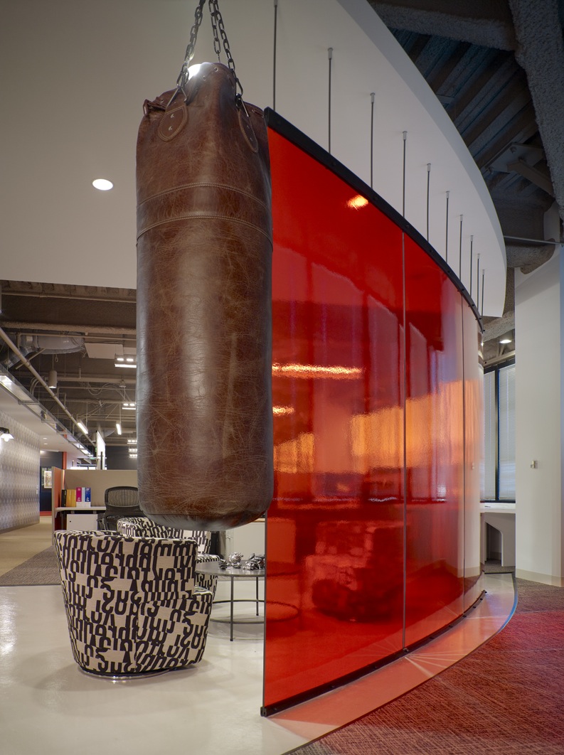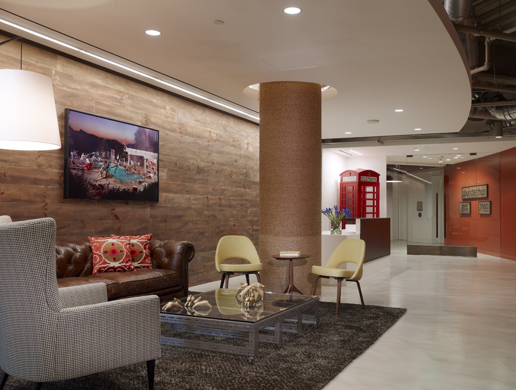 To create visual “noise,” the design introduces color and texture that convey Wunderman’s creativity. The lounge-like atmosphere features a vivid color palette. Unusual furniture, accessories and graphics act as conversation starters.