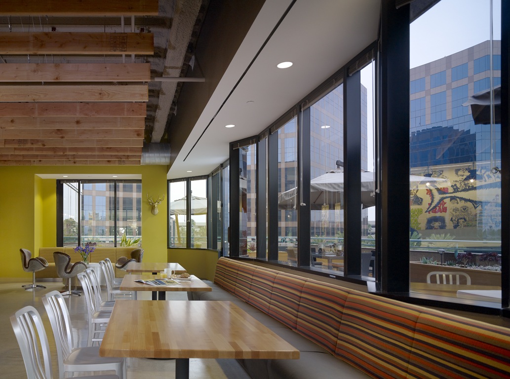 As a destination for breaks and meals, an employee cafe on the office perimeter links to an outside balcony with an open-air lounge complete with tables and colorful umbrellas. It’s an ideal, Southern California-style retreat for a staff of busy creatives.