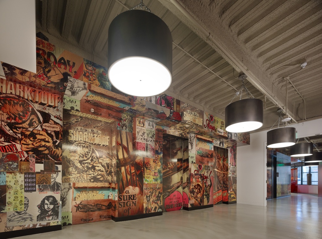 Visitors to Wunderman’s new floor are welcomed by a high-impact elevator lobby, which showcases a custom vinyl wall mural composed of assembled pieces reflecting the “apocalyptic” world of local graffiti artist Shark Toof.