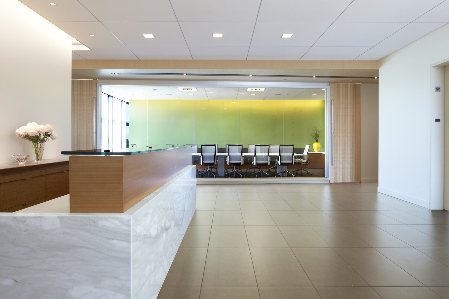 A light-filled office space, centrally located work surfaces, an open lobby, and glass-surrounded conference rooms create an open, vibrant workplace environment – one that’s transparent and designed for collaboration.
