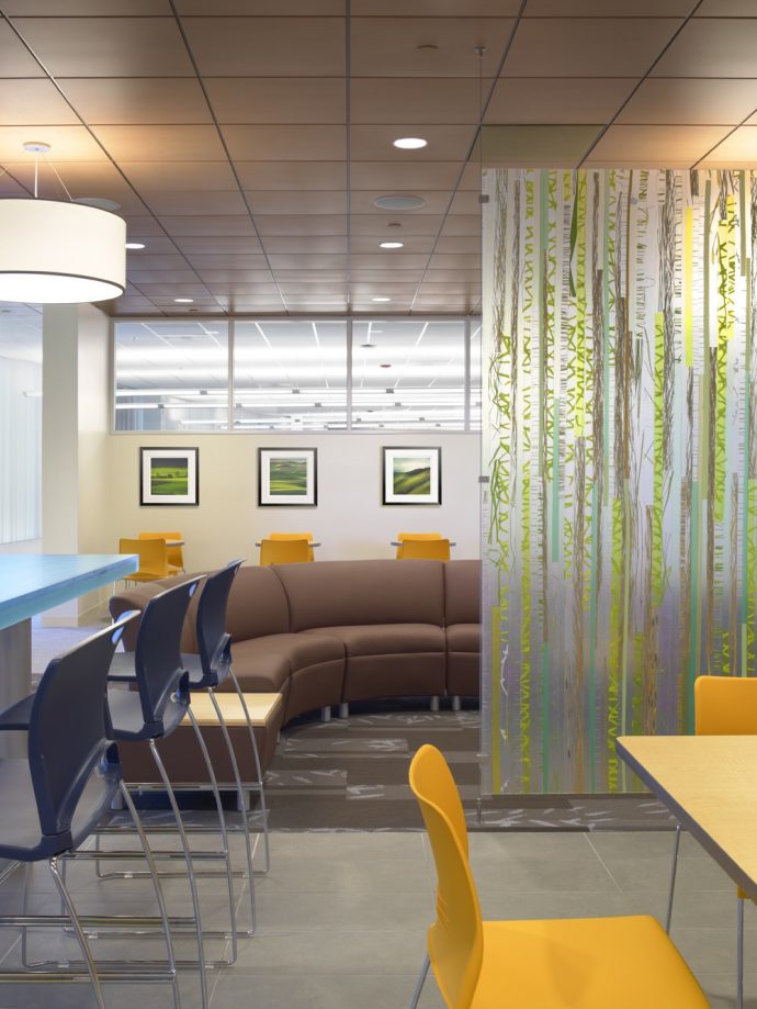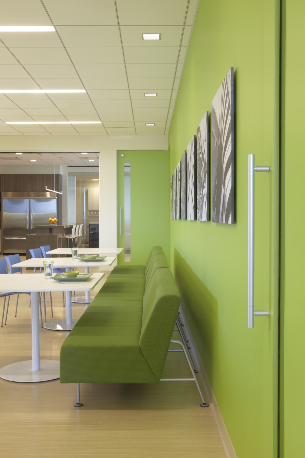 Renovated in 2010 and constructed to qualify for LEED commercial interior classification, the office is not just sustainable but social. A kitchen and cafe create a central meeting space and casual break areas are located throughout.