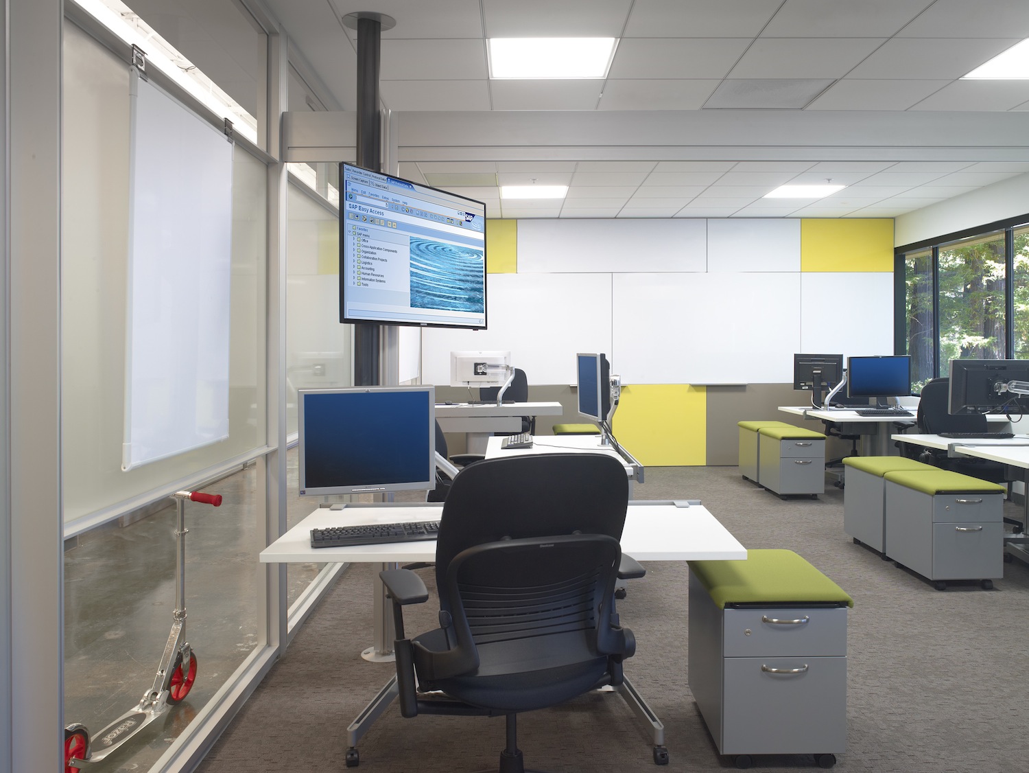 The only element that stays with employees from project to project is their personal locked “mobile pedestal,” which simply rolls to the next team room when it’s time to move on to another project. This encourages movement – and spontaneous collaboration.