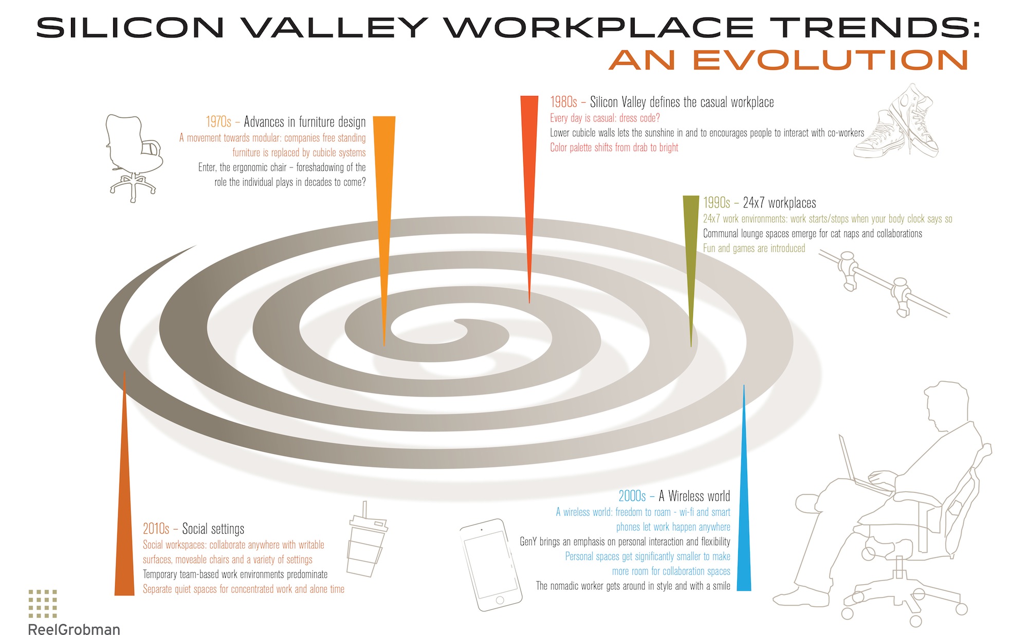 Silicon Valley culture and technology has radically changed the way in which architects and designers think about workplace design. Architects and designers once allocated 250 square feet per employee. Floor-plan design was limited by the realities of large, heavy computers and office equipment that stranded workers at their desks.