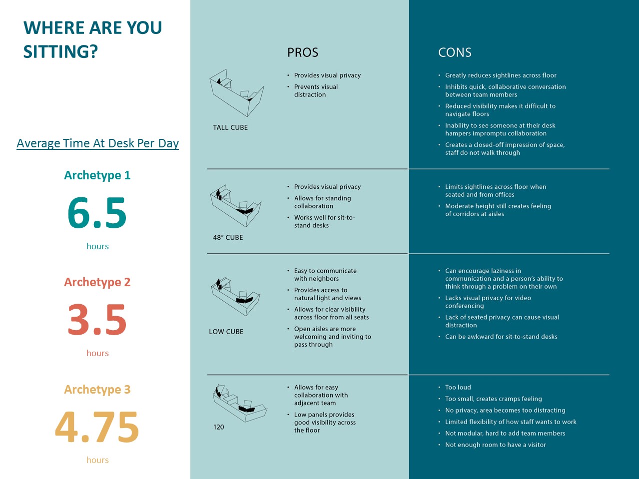 - The Mixed-Style, conversely, was a second archetype who also spent at least 60 percent of their time in the office, but was away from their desk for much of the day, far more collaborative, and constantly interacting with people and teams. This group didn’t require all of the components of a full workstation like the Soloist, but instead needed a home-base to pop into and out of during the day to complete quick task-based assignments between meetings. Additionally, their workstation might need space for a visitor to sit and have a conversation as opposed to the dual monitor setup deemed necessary by the Soloist.