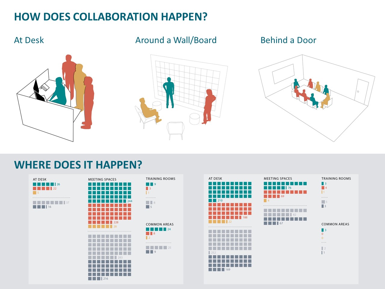When you take age out of the equation of how to do your job successfully, you’re left with tasks and behaviors. What tasks do I need to complete, and how do I want to go about completing them? What and how. These are the questions we ask to help inform designing a productive workplace. (We also ask Who, but that answer is company-specific.) When we ask about tasks, we want to know what things you do on a daily or weekly basis. Do you have routine assignments or do they vary frequently? Is your work predictable or is it sporadic, constantly changing and evolving? Or it is, more often than not, both? This leads us to understand how you, as individuals and, more broadly, as an organization, behave at work. Moreover, this line of inquiry allows us to venture beyond how you are behaving today in order to understand and seek out how you want to behave in the future. Are you a heads down, extremely focused company, or are you constantly buzzing with collaboration? Those options are, of course, the extremes of a circular spectrum in which many companies fall somewhere in the middle—and which are not mutually exclusive—but they give us a sense of what kind of organization you are and how you need to be operating to stay successful.