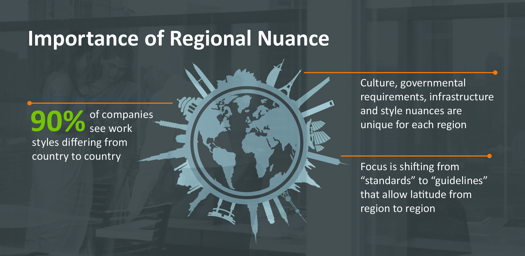The global standards of the past focused on providing a consistent kit of parts, design elements and strategies for rapid deployment and ease of management. But strictly enforced, standardized programs failed in many regions. Attempts to achieve uniformity across all regions have inherent challenges. Codes, regulations, and even construction and real estate practices often vary across locations. Personal space preferences and space allowances also differ from region to region. Even the significance of specific colors and acceptance of different color palettes can vary.