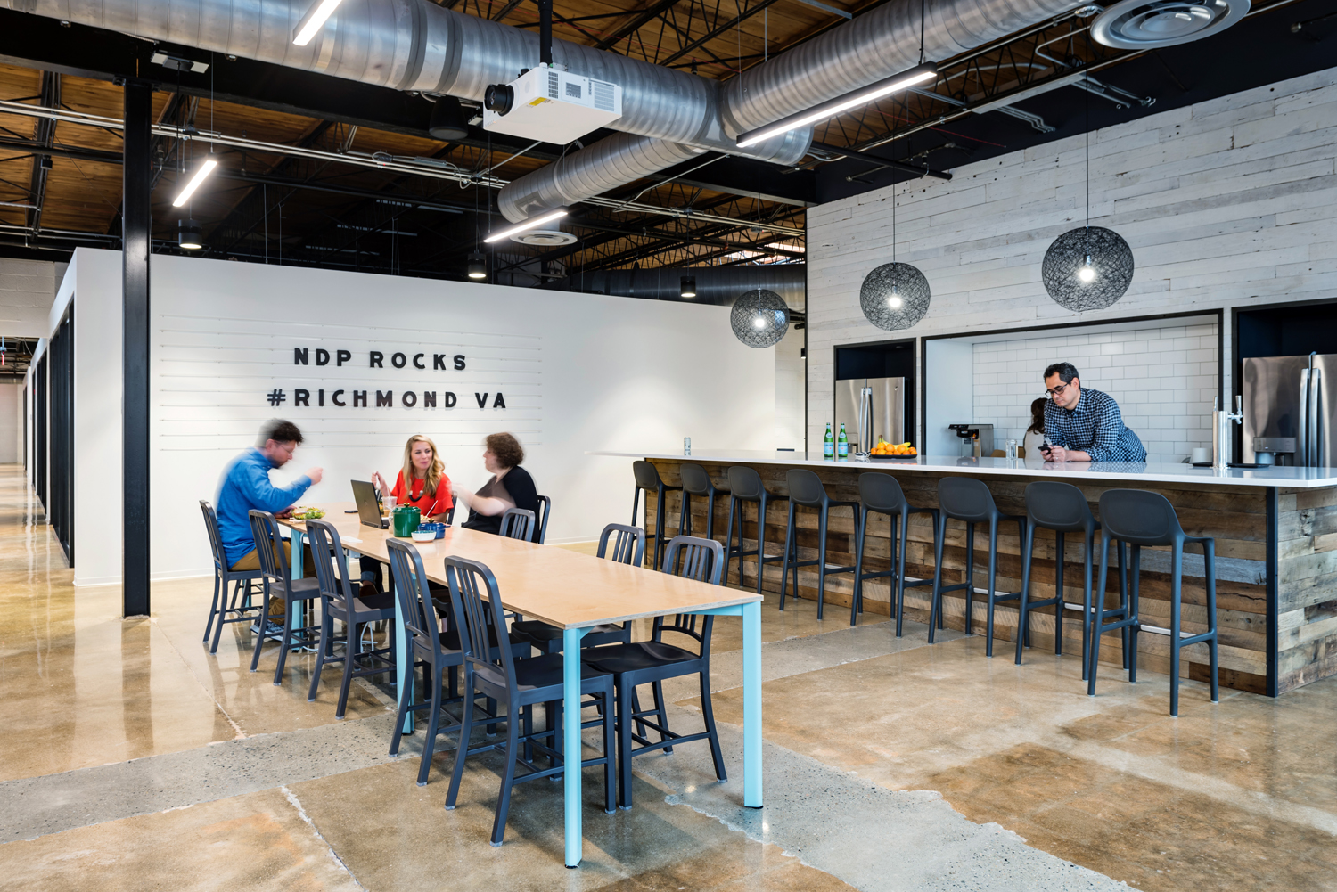 There were a couple of things about the space that we intentionally sought in designing it. We are in a 15,000-square-foot, one-story warehouse and we wanted to keep as much openness as possible with very few partitions, no large tables to make people work at, and a lot of light. We also built a very large work cafe that doubles as an eating, working, and gathering space. Throughout the day it becomes a large open area for people to grab coffee, a snack, and work there as well. With our remote workforce, a lot of us come and go, so our work cafe has become a popular feature of the space.