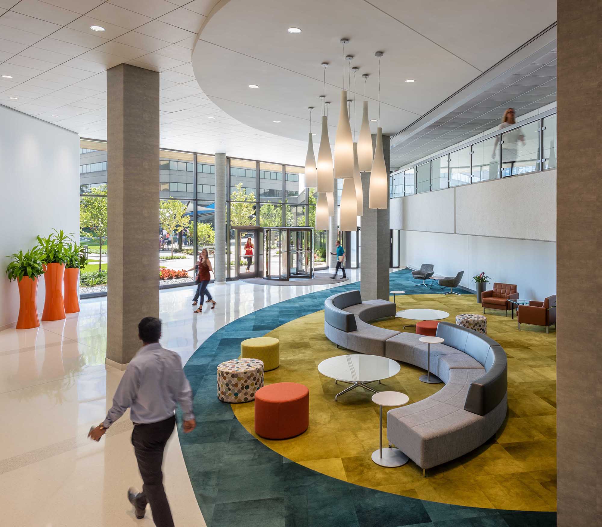 Hotel lobbies have long been designed to function as large living rooms, with seating areas that vary in size for large groups and individual travelers alike. Increasingly, office buildings are adapting this design approach to create small meeting areas, comfortable and relaxing retreats and to even function as central gathering places.