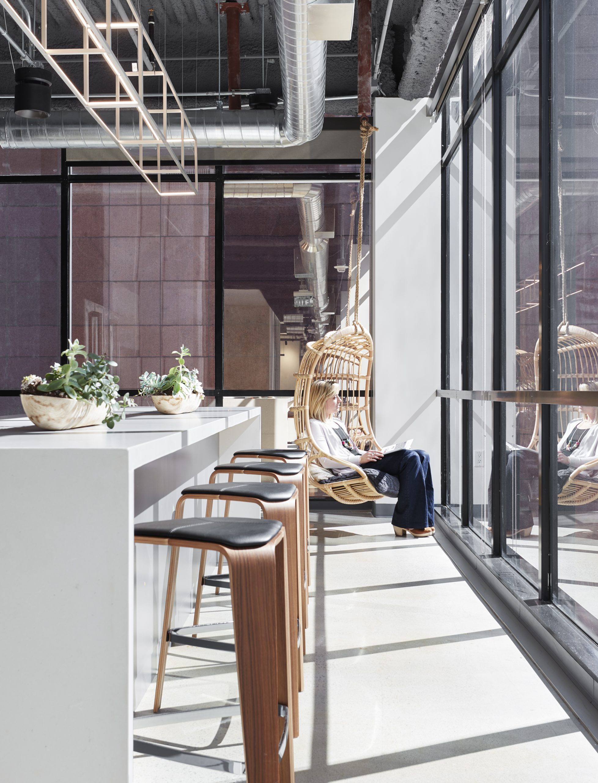 In warm weather areas such as California, outdoor spaces become natural community hubs that encourage impromptu gatherings and innovative conversations. In other areas, where the high cost of real estate means spaces are tight, locating these hubs, cafés or smart designs adjacent to outdoor areas help bring greenery and natural light in, creating a sense of wellness.