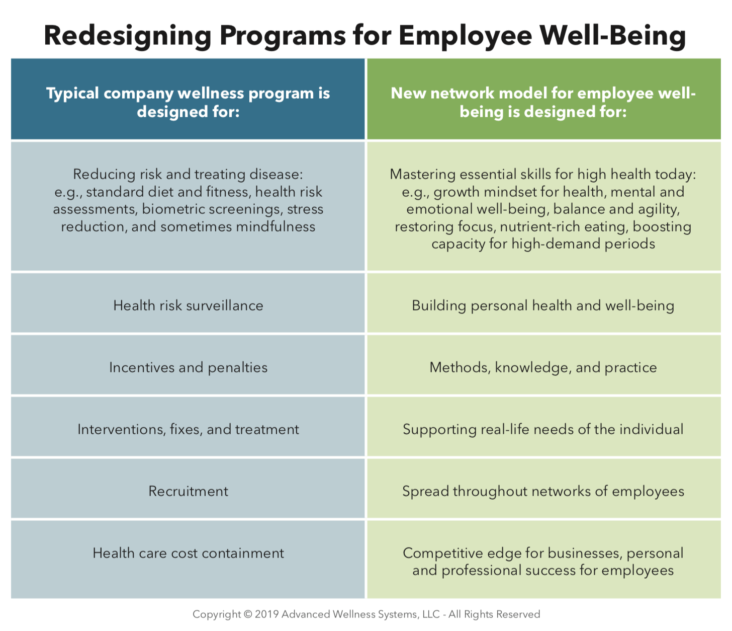 Likewise, our employee wellness programs are typically designed to solve health-related problems among employee populations. As we have seen, these efforts have not delivered the outcomes of high capacity that we have hoped for.