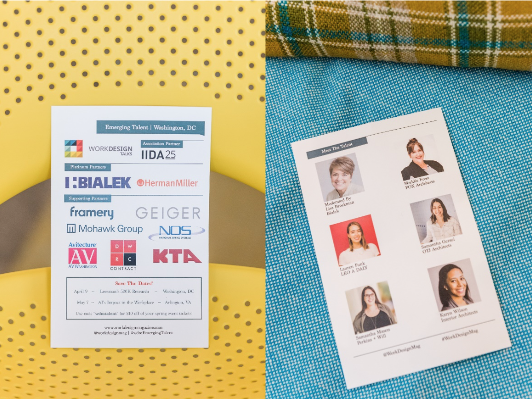 We teamed up with Lisa Brockman, A&D Strategist at Bialek, a Herman Miller dealer in the Washington, DC area. Over the past three years, Lisa has developed and implemented a professional development program for those just entering the design community. Bialek’s NextGen program, created with a team of industry experts is a series of seminars covering skills that will help participants learn and grow into leadership positions as they gain experience in their practice. Topics include many subjects key to developing a design career, such as communication and presentation skills, business etiquette and career guidance and practical topics such as “Furniture 101”. Our five panelists were selected from the 100 participants in the program to date.