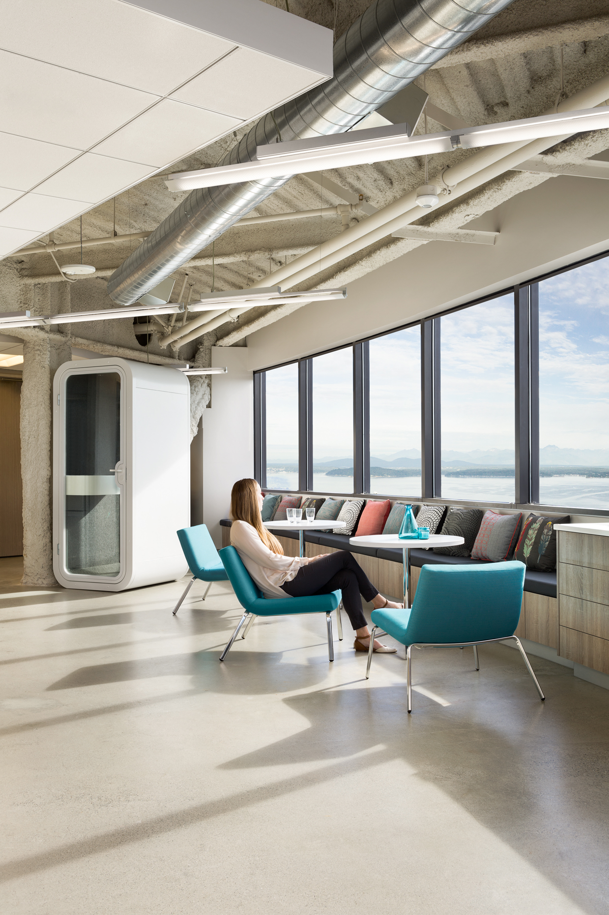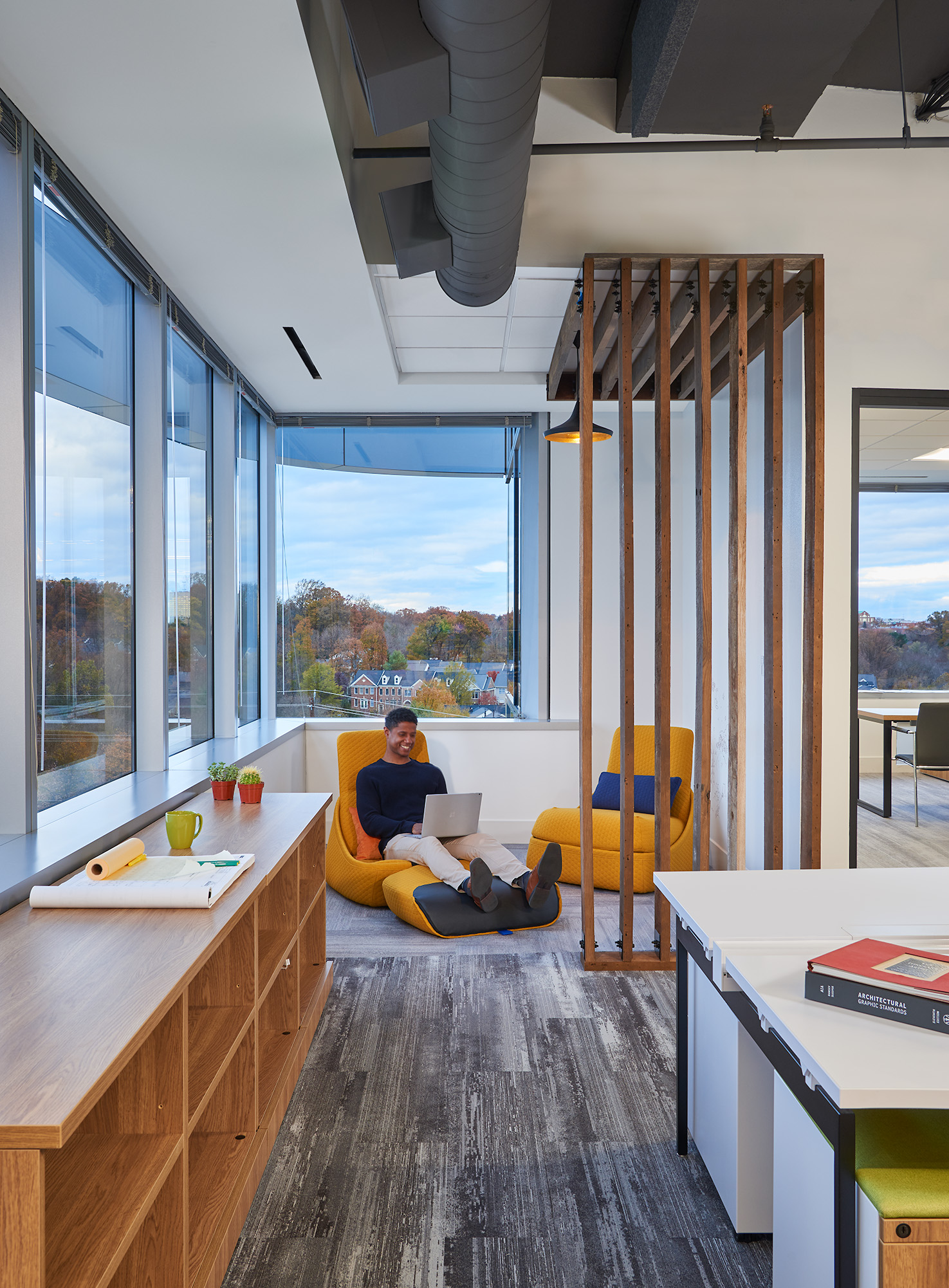 According to neuroscience, our higher cognitive faculties—focused attention, memory, and planning—the ones we tax the most during work, require that we recharge them throughout the day. And having access to a view to nature that offers both prospect and refuge (biophilic design’s most researched wellness pattern), allows occupants to scan a distant horizon line or gaze into the sky’s zenith. In addition to content, the dramatic change of scale in such an experience enables visual processing to facilitate one of the brain’s vital functions: cognitive restoration.