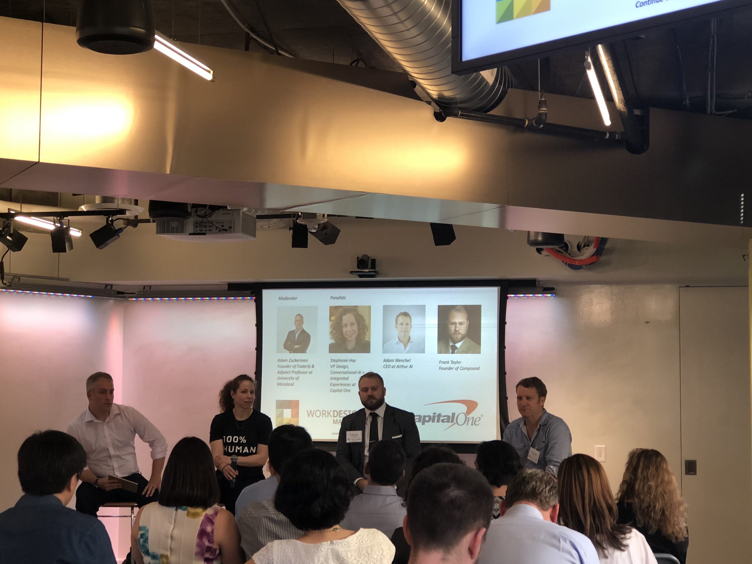 Our panel included Adam Zuckerman, Founder of Fosterly and Adjunct Professor at the University of Maryland, Stephanie Hay, Vice-President Design; Conversational AI + Integrated Experience at Capital One; Frank Taylor, Founder of Compound Technologies, Inc.; Adam Wenchel, CEO at Arthur AI.