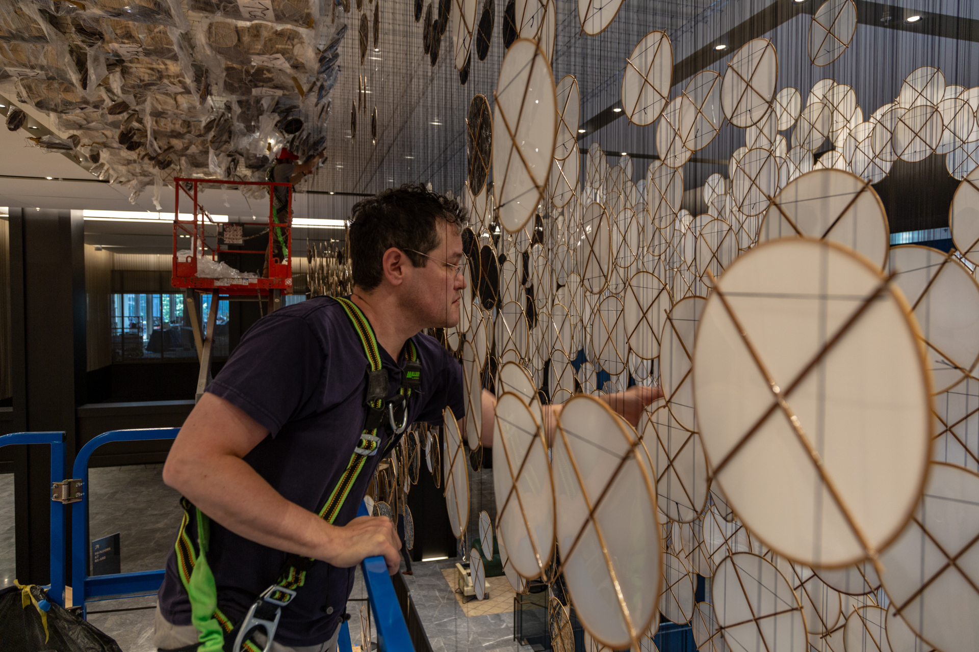 The size and scale. If there was a mistake, it would have been a major issue and required a huge reconfiguration. That would then push the schedule and we would have run out of time. We had to meet the deadline of reopening the building lobby, which is why we revisited the model over and over. We fabricated the piece in components which were then shipped to the job site. There is as much engineering as artistic endeavor in a project of this size and scope! A team of professional art installers was also engaged to work on the installation.