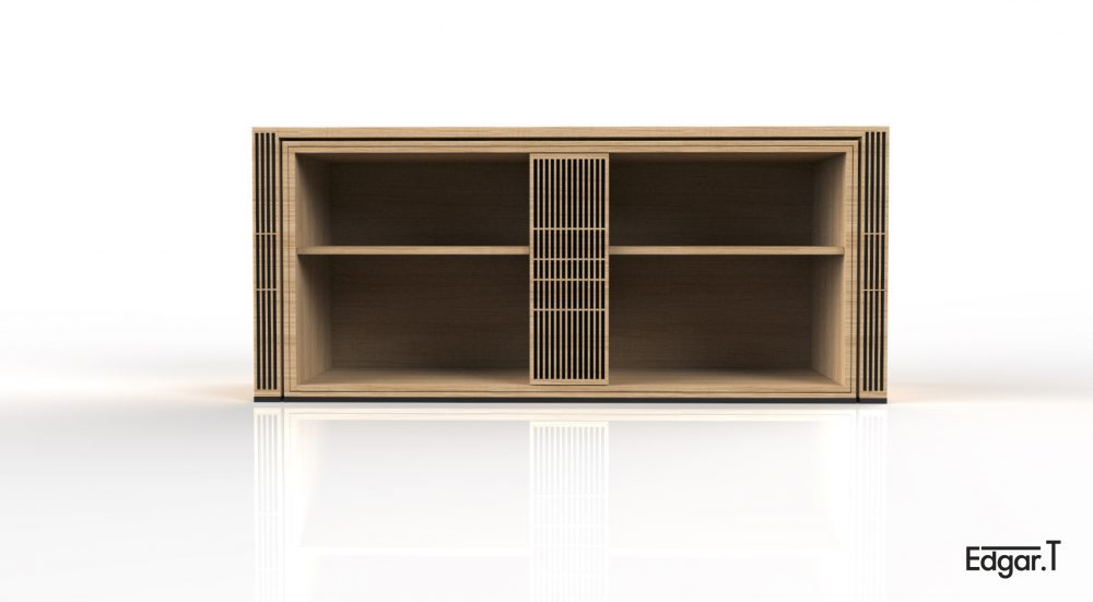 All integrated technical and office devices have been designed in black, whereas a light wood finish has been selected for the main furniture to tie in well with current interior trends, since Edgar. T is simply not just a comfortable workstation. All office related features, Edgar. T is equipped with, can be hidden and stowed away, and therefore Edgar. T retracts into a simple wooden sideboard, when not in use: lamp, computer screen and docking station are lowered into the side of the furniture until hidden, for ease of usage supported by gas springs. The standing desk is lowered into the work surface, supported by gas springs. The L- shaped work area is closed and retracted, with a guided movement by the mechanism CM4070. While Edgar. T acts now as a furniture feature in the room, the space previously occupied by the full office capacity of Edgar. T can now be used for living and entertaining purposes, also indicating psychologically to the user that office time has ended for the day.