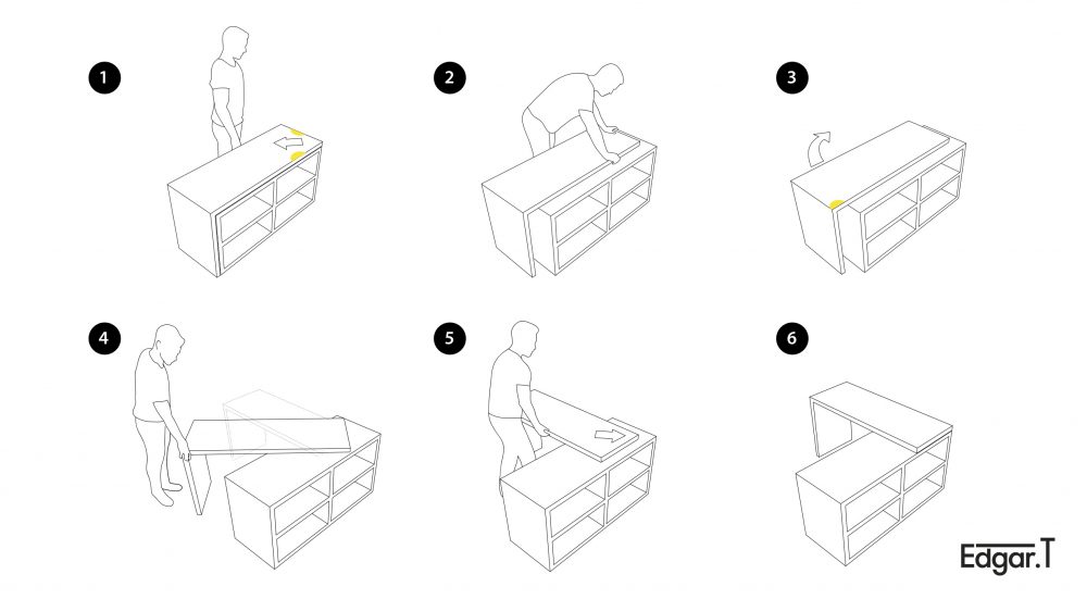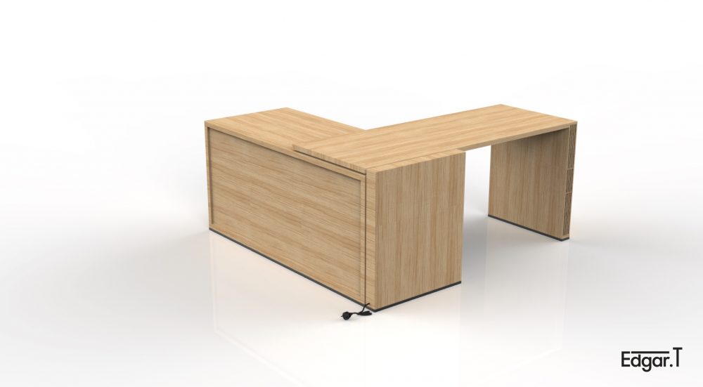 The furniture concept Edgar. T was designed to offer a comfortable work set up within space constraint living environments. The working comfort on one hand is provided by a number of integrated office features such as a desk lamp, a computer screen, a docking station with USB/HDMI ports and electrical sockets for additional devices. The actual desk area consists of an L-shaped arrangement of two large working surfaces, with the additional option to switch to a height adjustable standing desk when required. Edgar. T is equipped with a cabinet with drawers for ample storage of office utensils, as wells as the WIFI mouse, WIFI keyboard and a laptop, when not in use. In addition, shelves within the furniture offer storage space for files, binders, books or simply notes.