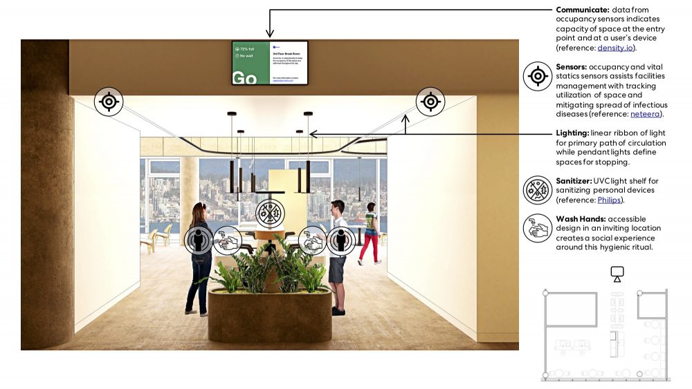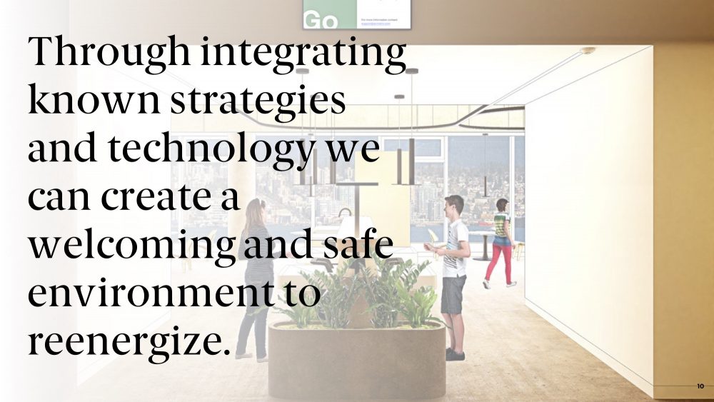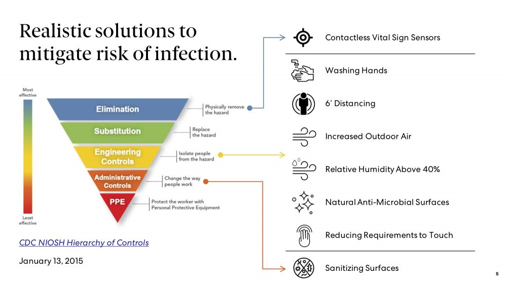 There are technology solutions ready or soon-to-be ready we can start to integrate. Such as touchless appliances and fixtures, density trackers, vital statistics sensors, UVC sanitizers, and automated operable windows.