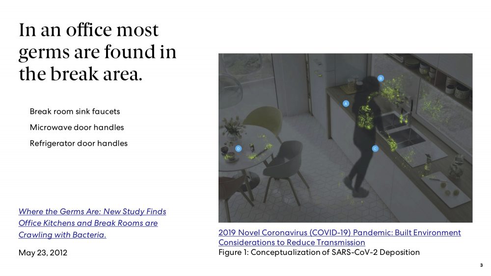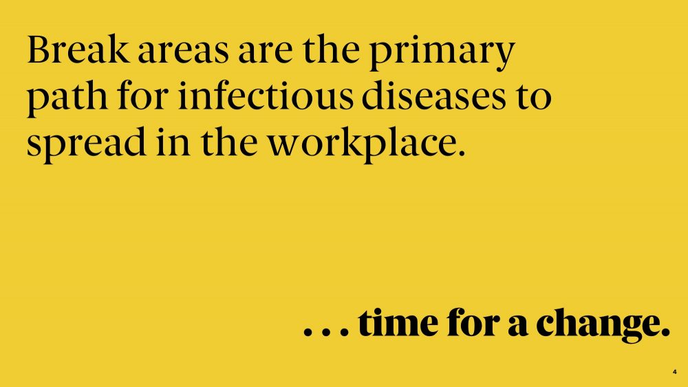 Break areas have also been a great space to spread germs. Many surfaces to touch without the cleaning protocols to keep up and rapid fluxes in occupancy density without a quick response HVAC system means this space becomes the primary path for the spread of germs in the workplace.