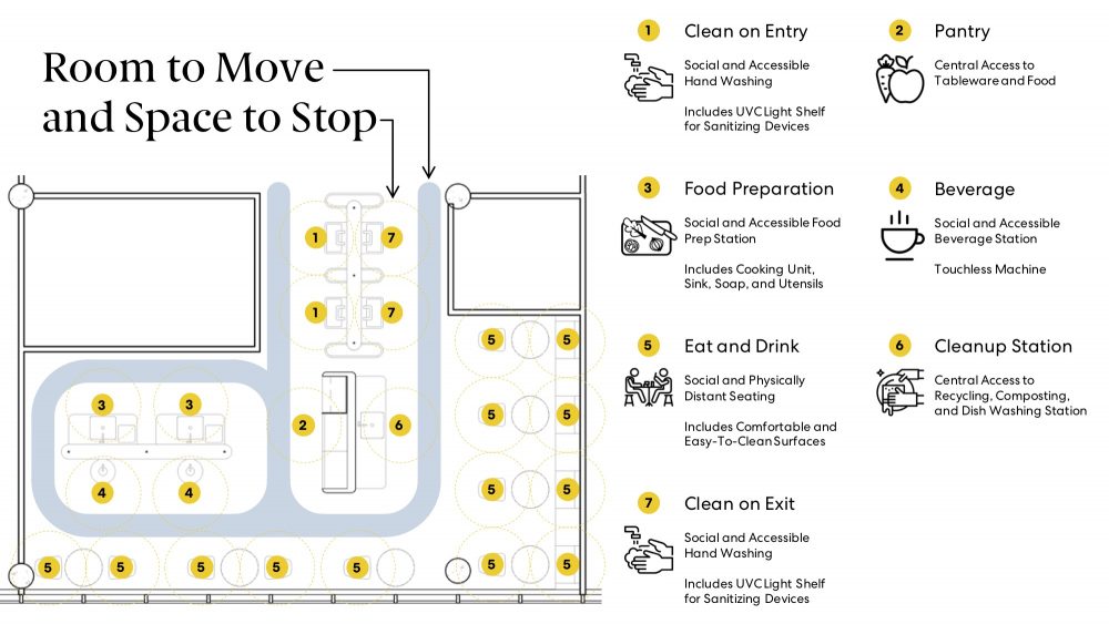Looking to teaching kitchens and cafeterias we can borrow principals to release the log jam. Such as separate and individual hand-washing stations, separate and individual food prep stations, centralized kitchenware and food storage, centralized cleanup station, separate and individual beverage stations, ample circulation space, and separate seating areas.