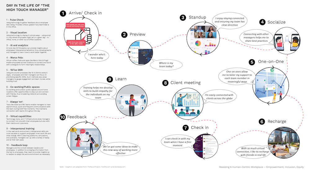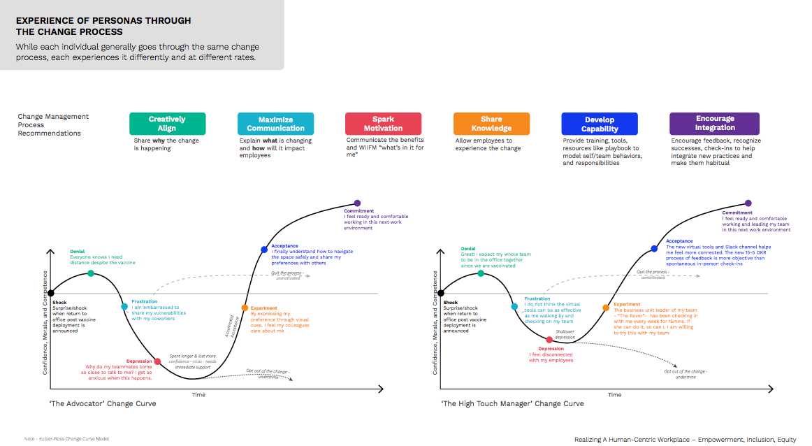 Realizing a human centric workplace was the strongest submission from the ones that I read because it provided a clear process map. It provided an emotional process map going through the five stages of grief and in a normal process and then through intervention, how you could minimize those stages of grief. It also provided “A Day in the Life” map with for personas. I found that extremely insightful and helpful in terms of getting my mind around what was going on and putting myself in the shoes of people that we’re going through this, not only the change management people or the employees, but the managers. I really liked the persona assessment.