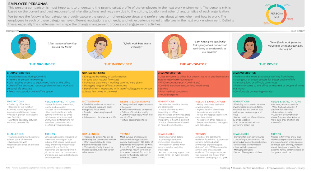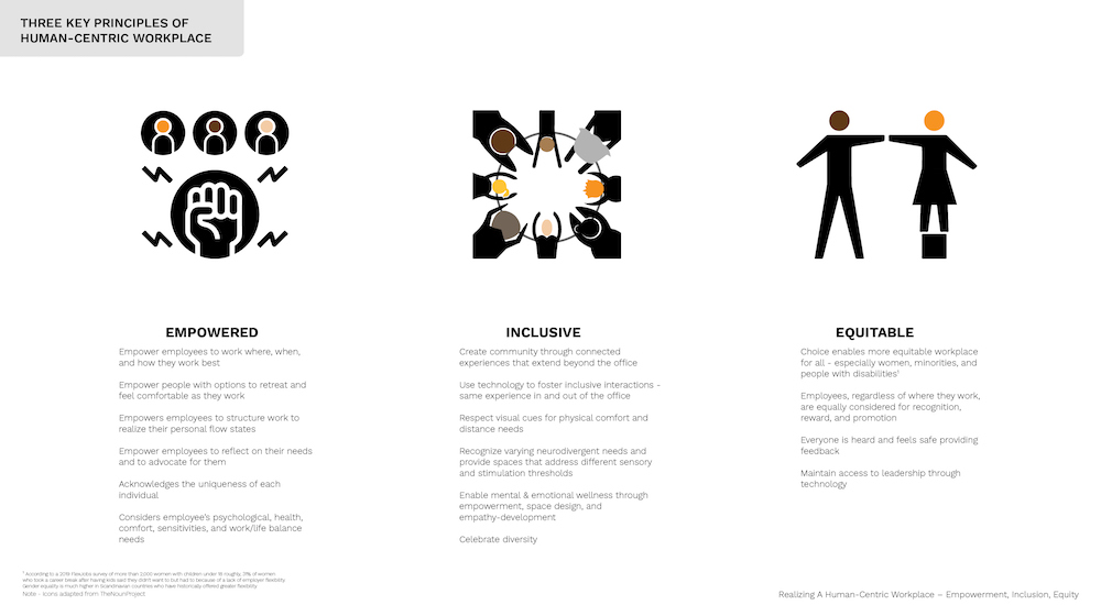 One year or more from now, once we are able to return to the office with some level of normalcy, the workplace will become more tailored to support individual employee needs. This will be manifested in varying ways: for some it will be a place for socialization, for others a place for focus, while still others connect. The physical office may take many forms, such as a hub and spoke model, or a blend of co- working spaces and home offices. Regardless of the form, central to this new work environment will be its focus on the individual, designed through a truly human-centric approach. Outcomes will include a culture of equity, inclusion, and empowerment that honors the individual spirit in order to realize a collective mission and common goals.