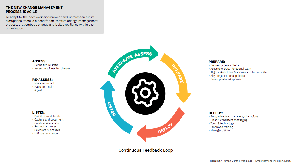 There will be challenges to a hybrid work environment. The office has historically been seen as the nexus of an organization’s culture, and an expression of the company’s personality. If we aren’t always in the office, how can we stay connected to the culture, the work, our peers and leadership, our professional development and evolution within the organization at the same pace as our more office- bound peers? Must we depend on those that are physically present to remember those that are remote? If enough people make change happen, and the rules of engagement change, then change happens – but only if it is supported by a process that recognizes transformation is in the works and that everyone, at every level, must be involved.