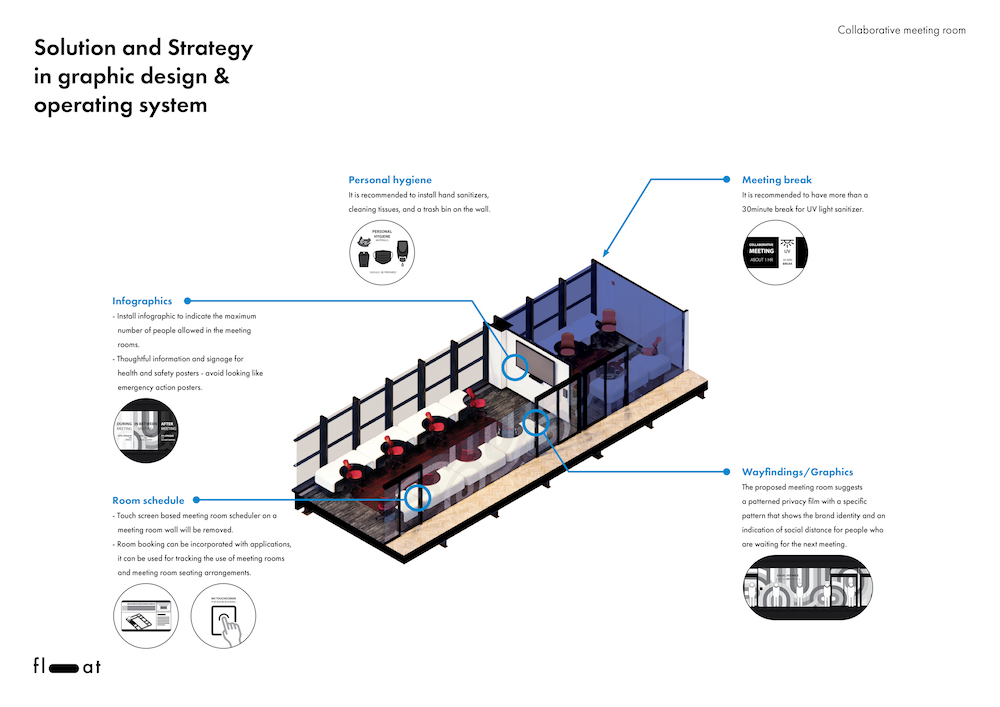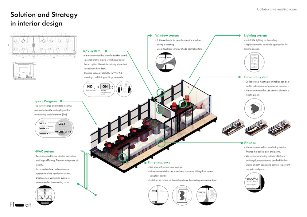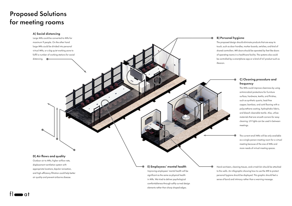 The COVID-19 has profoundly impacted to a general frame of the environment in an office. While the pandemic has been breaking out, office workers have reported their emerging issues of life and work balance, needing appropriate tools for their job complete, and losing the motivation by disconnecting from their collaborators. In 21c, office design has been focused on two main issues to improve work productivity. One is the employee’s physical, emotional, social wellbeing, and the other is collaboration. For this competition, we consider one of the collaborative spaces, MR. A meeting room will be a crucial challenge in post-COVID-19 office design because it is mainly not for creating a social distance but for being closed in order to create good teamwork as well as to socialize with colleagues and clients. MR could be categorized by sizes (small, middle, and large) and purposes (formal and informal). Small MRs (Huddle room, Phone booth, and War room) are for up to 4 people and usually spaces for informal conversations. Middle MRs (6Pax, 8Pax, and 10Pax) are for up to 10 people and large MRs (12 Pax, Large conference room, and Town-hall MR) are for more than 10 people. These two types of MRs are likely for formal conversations. Before COVID-19 pandemic, the elements below were required for MR design: 1) quantity and quality of tables and chairs; 2) multi-media systems with connections; 3) room reservation system; 4) wayfinding and accessibility; 5) branding; 6) lighting control including both artificial and natural; 7) acoustic and visual control for privacy issue; 8)HVAC control system for thermal comfort. However, for MR designs in Post COVID-19, potential subjects below should be considered: A) Social distancing; B) personal hygiene; C) cleaning procedure and frequency; D) air flows and quality; E) employees’ mental health.