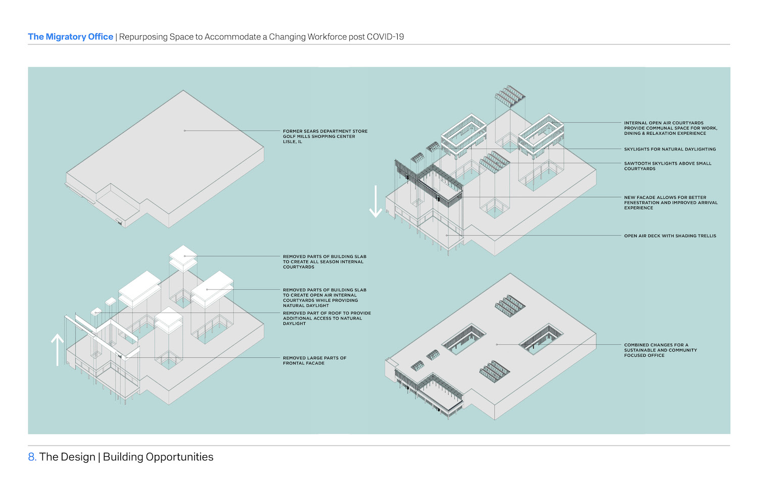 “The idea is still in the conceptual phase with huge potential to develop further. The pandemic created a rapid migration of office workers from central business hubs just as brick-and-mortar retailers have transitioned to a more online presence. This phenomenon is still evolving due to its nature and design solutions need to constantly adapt.