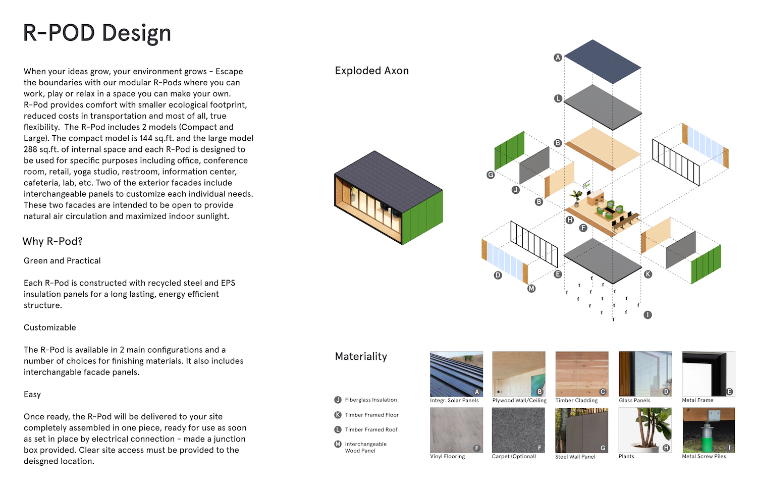 The main component of the R-Hub’s infrastructure is the R-Pod. An R-Pod module provides comfort with a smaller ecological footprint, reduced costs in transportation and most of all, true flexibility. The R-Pod includes 2 models (compact and large). The compact model is 144 sq.ft. and the large model 288 sq.ft. of internal space. Each R-Pod is designed to be used for specific purposes including office, conference room, retail, yoga studio, restroom, information center, cafeteria, lab, etc. Two of the exterior facades include interchangeable panels to customize each individual needs. These two facades are intended to be open to provide natural air circulation and maximized indoor sunlight.