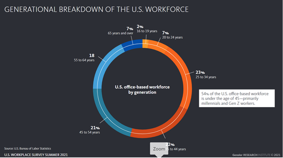 In addition to the disruption of the past, we also recognize the workforce demographic is clearly changing. According to the U.S. Bureau of Labor Statistics, 54% of the U.S. workforce is now under the age of 45. Coupled with the ever-present war for talent, understanding these broad, generational differences in expectations and values is more crucial than ever.