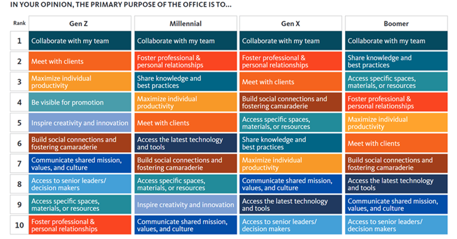 What does each audience need to know and when? What anxieties may be inhibiting from adopting change? What does successful change look like for them? For example, our research shows us that younger workers – particularly GenZ – have a different conception of the workplace. Workers across all ages prefer a mix of in-person and remote. However, younger workers have a more holistic vision for functions of the workplace. Supporting for a range of experiences and preferences will require a range of communication styles.