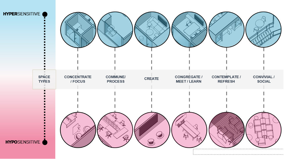 When we look at the spatial needs in the context of responding to the senses, a truly inclusive workplace must have a variety of spaces types that respond to all sensory stimuli of the hypersensitive, hyposensitive and everyone in-between.