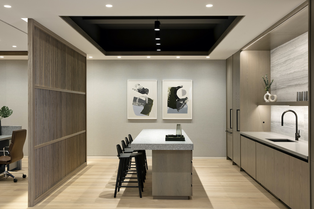Locating the pantry next to reception was different from what the client was accustomed to; they were concerned about visitors seeing a messy pantry which usually feels more back-of-house. By elevating the pantry finishes, Fogarty Finger designed a high-end visitor-facing space which has the subtle effect of encouraging office staff to keep it tidy. The pantry can also be used as an informal meeting space if the conference & huddle rooms are occupied.