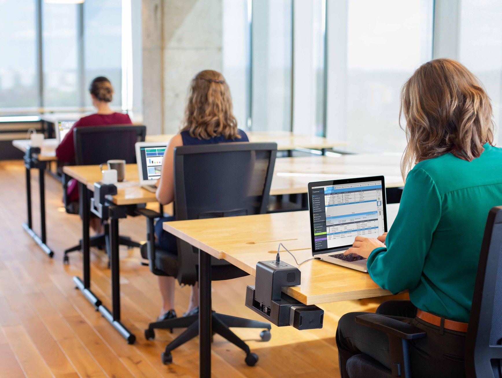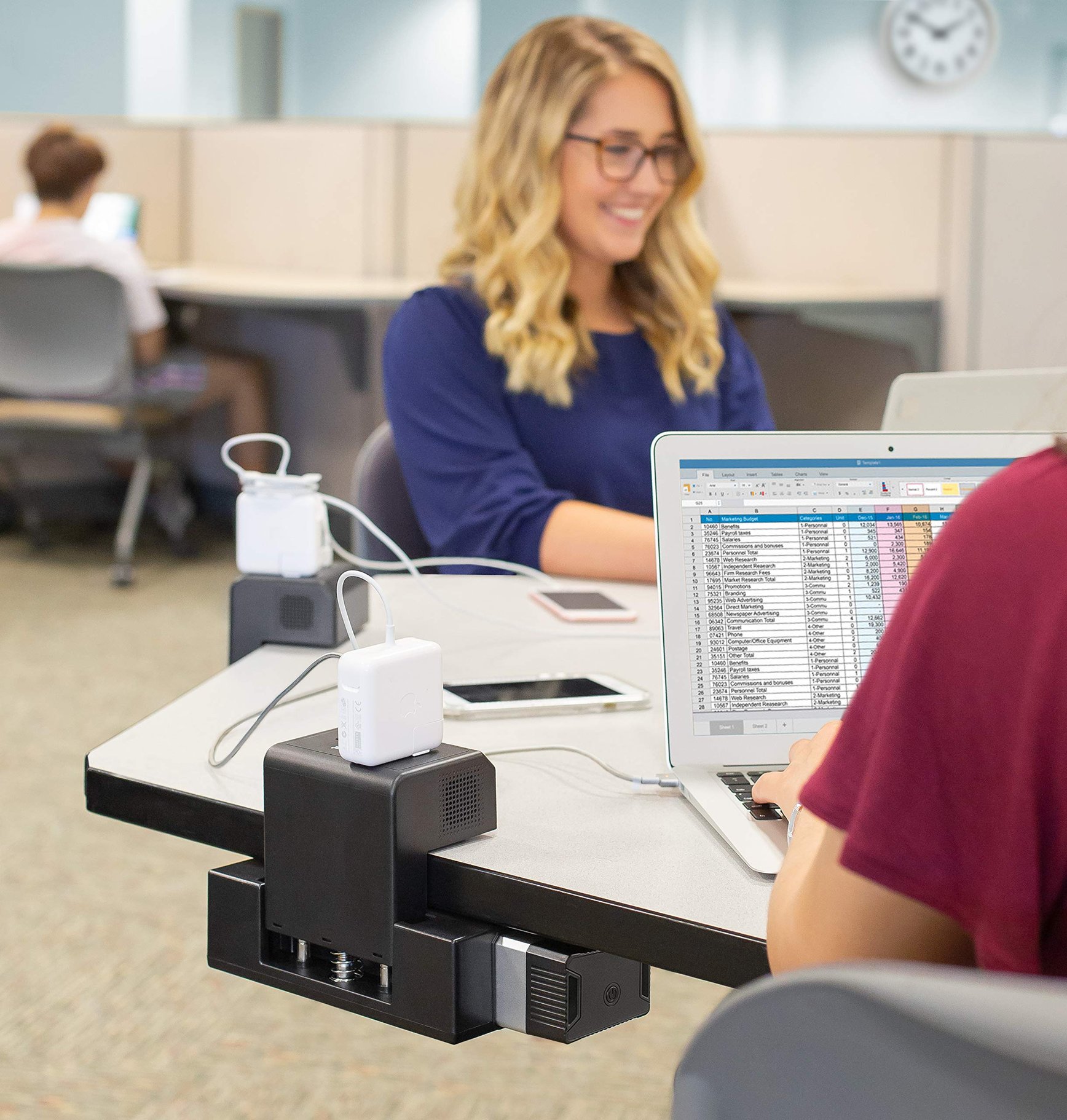 EdgePower charging is a total solution for laptops and mobile devices in workspace and classroom environments. EdgePower eliminates extension cords by putting power right where you need it. Each EdgePower Clamp-On Charging Unit features an innovative design that easily attaches to most tables and desktops. EdgePower offers a standard AC outlet, a USB-A charging port, and a USB-C PD charging port to be used for your devices. An EdgePower Rechargable Battery is inserted that will provide power, eliminating the need for extension cords or outlets. The battery provides enough power to charge typical laptops up to 2 times, average Chromebooks or tablets up to 4 times, and standard smartphones up to 14 times. If desired, each Charging Unit can also charge a laptop and 2 mobile devices simultaneously.