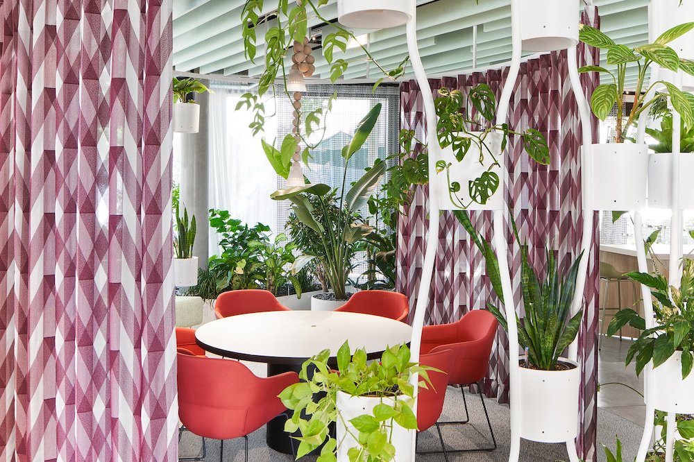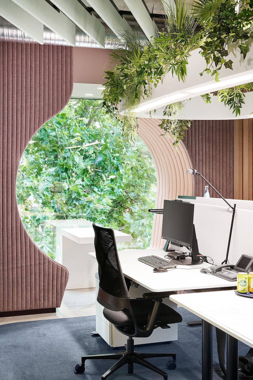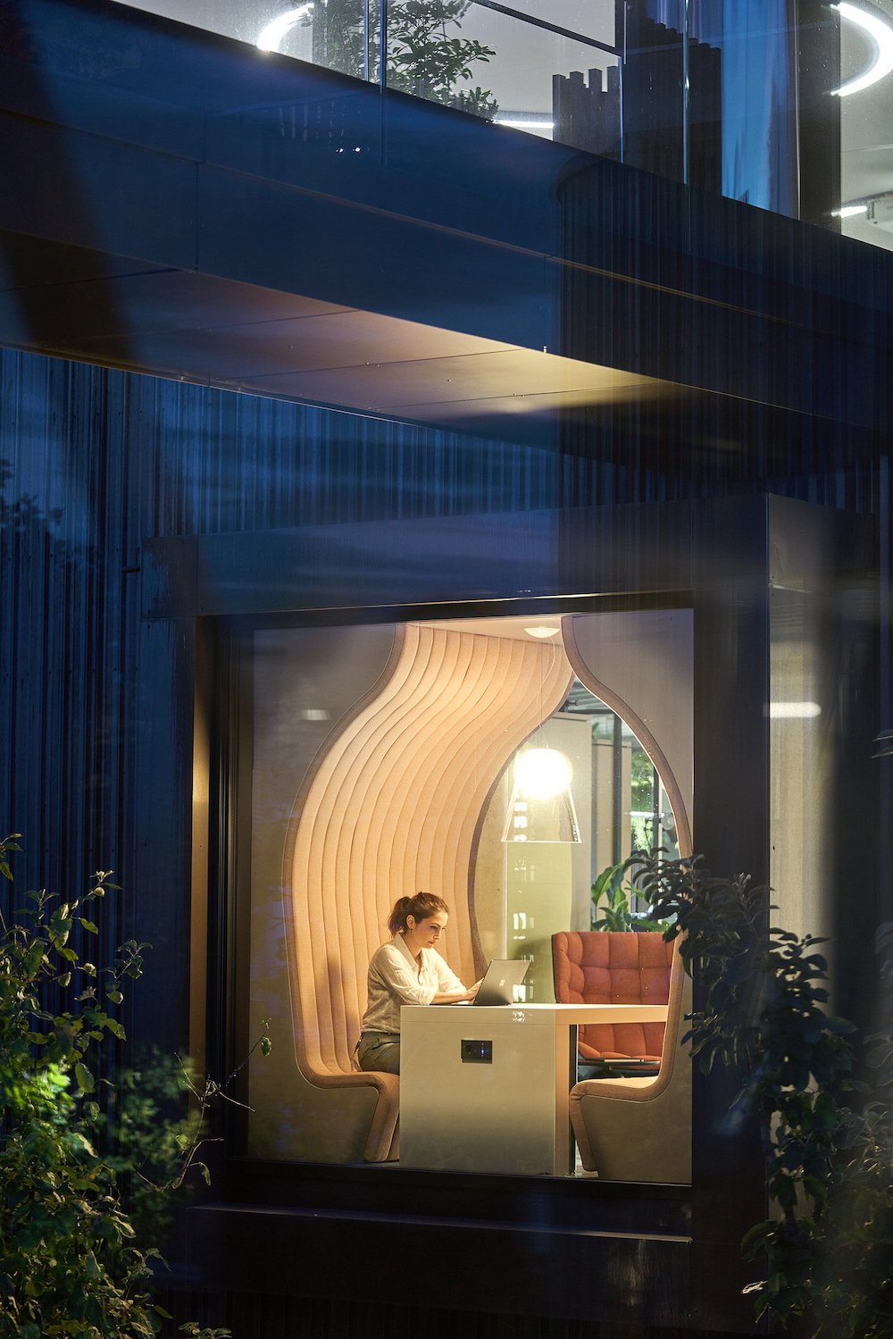 The alcoves serve as places of retreat or as meeting niches. Because besides concentration, collaboration and communication, contemplation, the targeted switching-off of the mind, is also an important mode of work. And the company proudly displays its working culture to the outside world. The top floor is the creative tree crown. A meeting room with a mobile partition wall and non-static furnishing encourages agile working practices. Surrounded by lush green planting, the Innovation Pavilion is a creative jungle – and anything but a classic conference room. Combined with the roof terrace, a space is created for a new kind of togetherness.