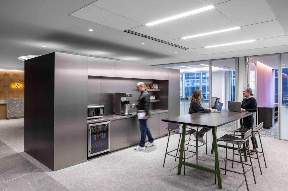 NELSON: Adaptation is key when designing the evolving workplace. Designing spaces with flexibility and adaptability is essential to limit construction related changes in the future. Throughout the design process we targeted specific desk-sharing ratios to support the projected hybrid needs of the client. These ratios changed due to a change in policy of dedicating some desks and offices and because of an uptick in daily attendance. Since the office is doing what we planned and magnetizing employees back, we realized the third spaces, like café tables and booth seating, become even more valuable to the experience of the space. We could see these work lounge spaces become larger or even more varied to offer tailored experiences to each person who decides to return to the office.