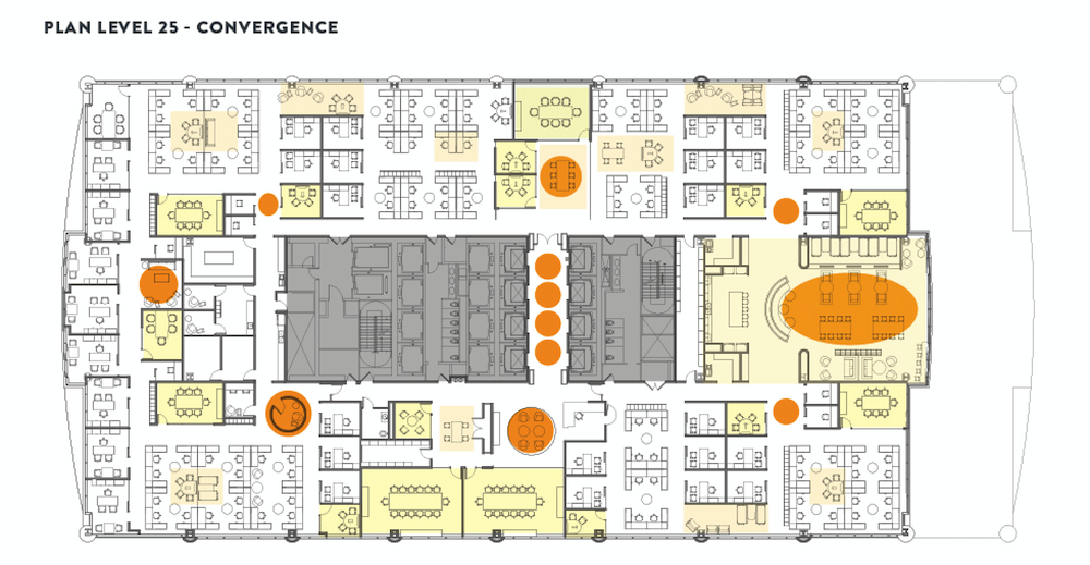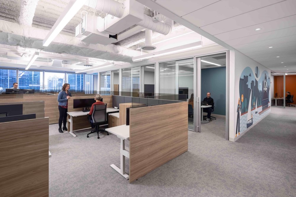 Strategically broken down into departmental neighborhoods, the floor plan is equipped with a wide array of phone rooms, conference spaces and adjacent offices for convenience, while supporting their new flexible working strategy. Four open collaboration zones, designed by Four Four Design, are located throughout the office to embody a unique sense of place. Each one of the zones has its own look and feel that coordinate with the architectural finishes and Sinch graphics.