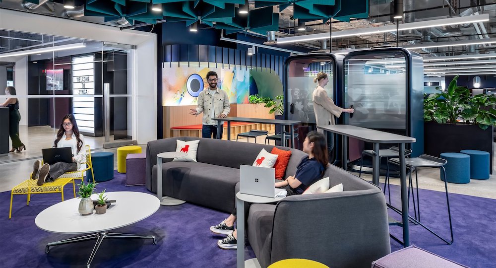 Adjustable work settings have been fundamental for Zynga as a collaborative business tool for their various meeting styles. The new space features updated AV technology for virtual meeting connectivity and a flexible mix of collaboration areas, meeting rooms and phonebooth-style spaces for individual work. Moreover, as the next evolution of Zynga’s workplace, this fusion of traditional and collaborative spaces encourages hybridisation and mobility.