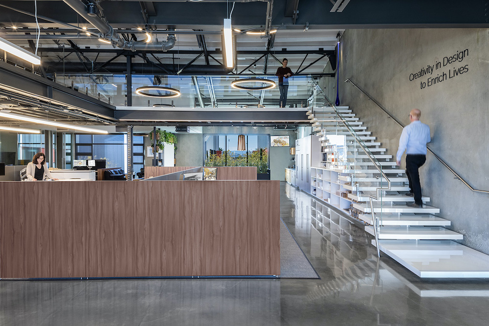 - A communal café table hinges into a beverage cooler and can rotate 90 degrees, allowing the space to open for events or large group design discussions.