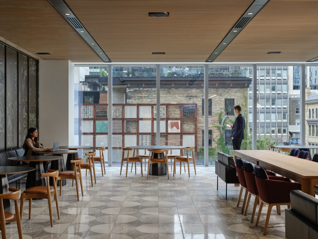 Establishing continuity in materiality and experience throughout the stack underpins the democratic deployment of design across all business lines, while subtly modifying elements to provide differentiation. The large café, meeting rooms, private dining rooms, lounges, and reception areas act as third spaces for employees and clients. Spaces for collaboration were given as much attention as workstations, and to maximize access to natural light for all, there are more open interior spaces than perimeter offices. Flexibility is integral, with floor plans, furniture, and technology chosen to accommodate the diverse work styles and programmatic requirements of various business lines.