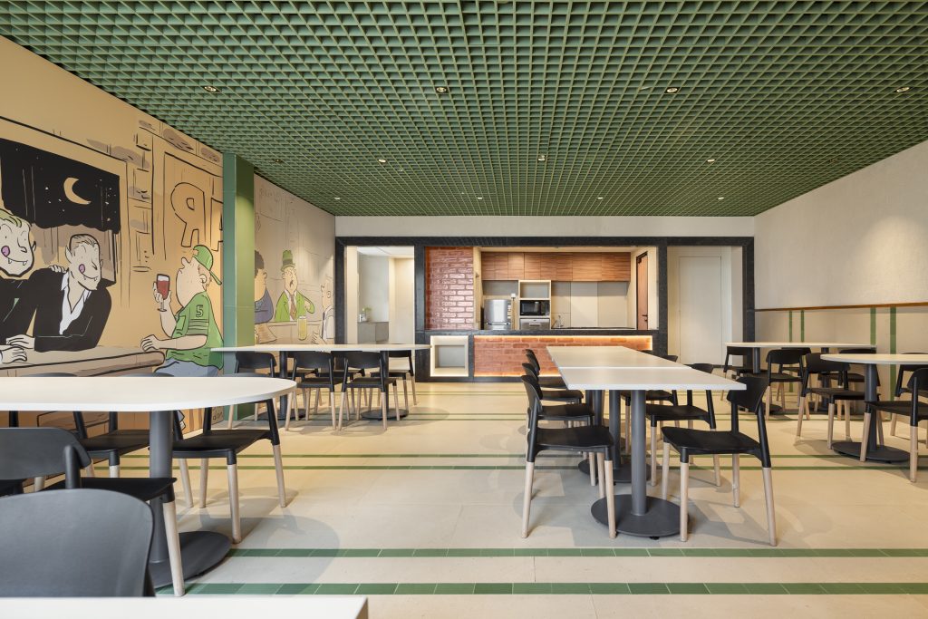 All the open-plan workspaces are designed to promote interaction and collaboration. 33 metres of column-less space in the training room has been ingeniously converted into makeshift conference rooms using foldable doors. Incorporating movable partitions further bolsters this flexibility, enabling rooms to morph seamlessly to accommodate various activities and privacy levels effortlessly. At the heart of this space, the twin training rooms feature three sliding-folding partitions that seamlessly connect to the open work hall. When opened, these flexible spaces accommodate large gatherings, activities, and events—an integral part of Carlsberg’s vibrant culture.